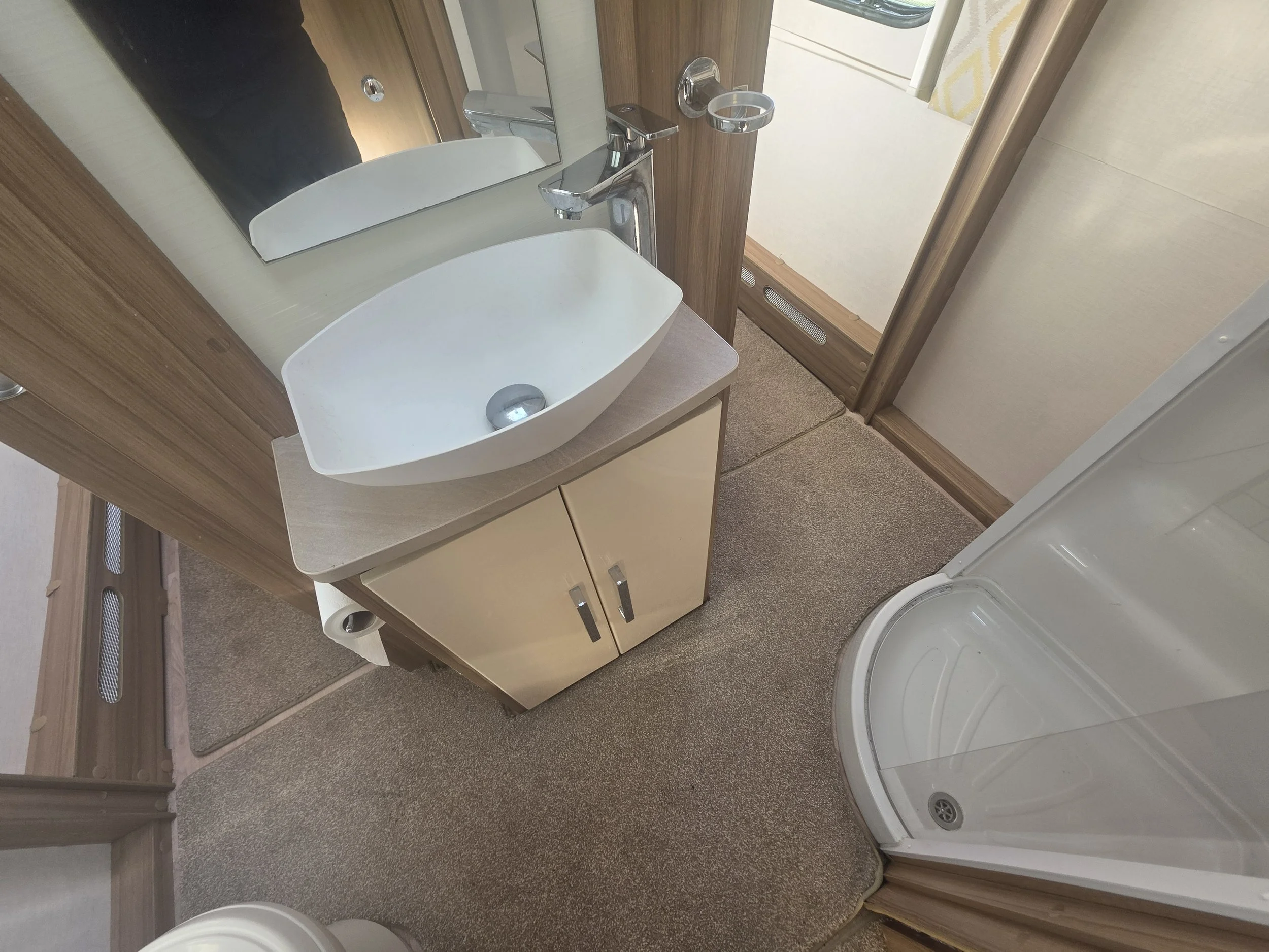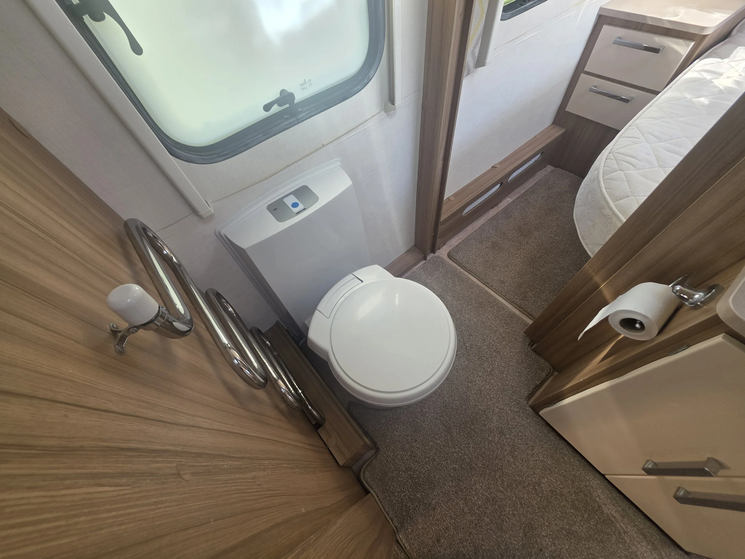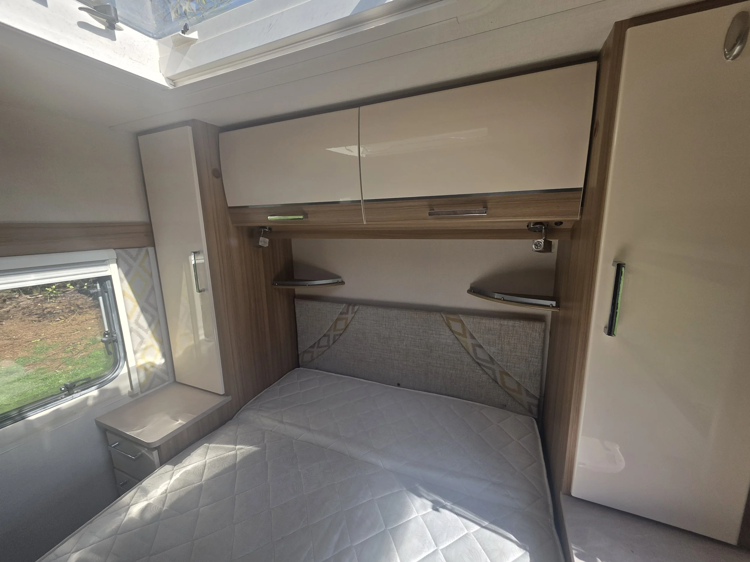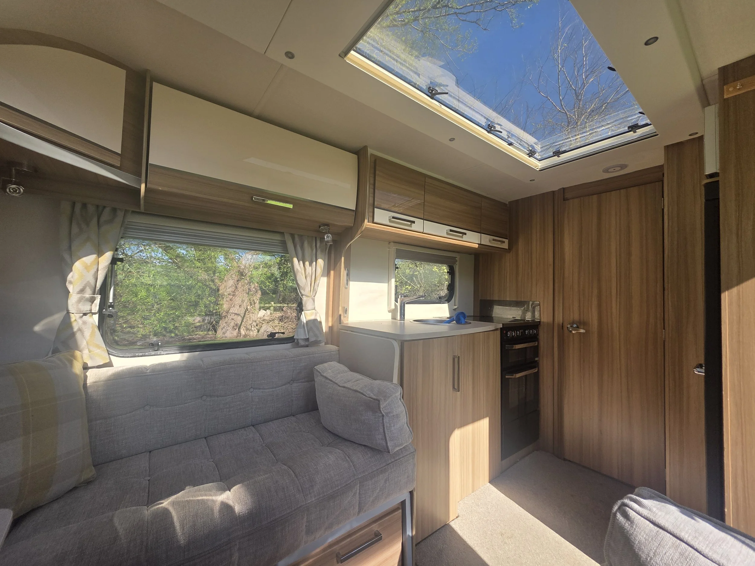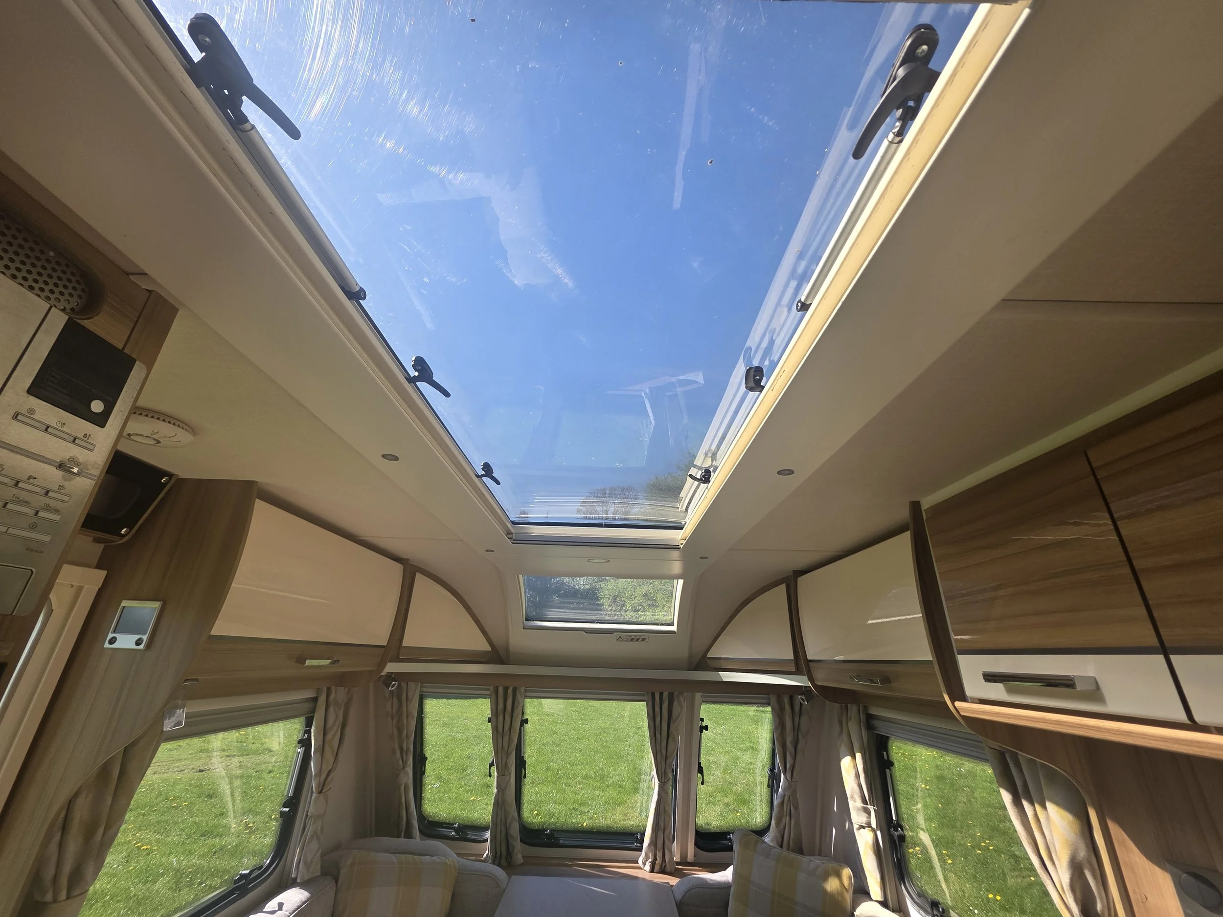 The popular end washroom layout provides a spacious and private bathroom with a separate shower, toilet, vanity unit, and generous storage. At the front, the bright lounge area benefits from large windows and a panoramic sunroof, creating an airy and welcoming space that easily converts into a comfortable double bed.