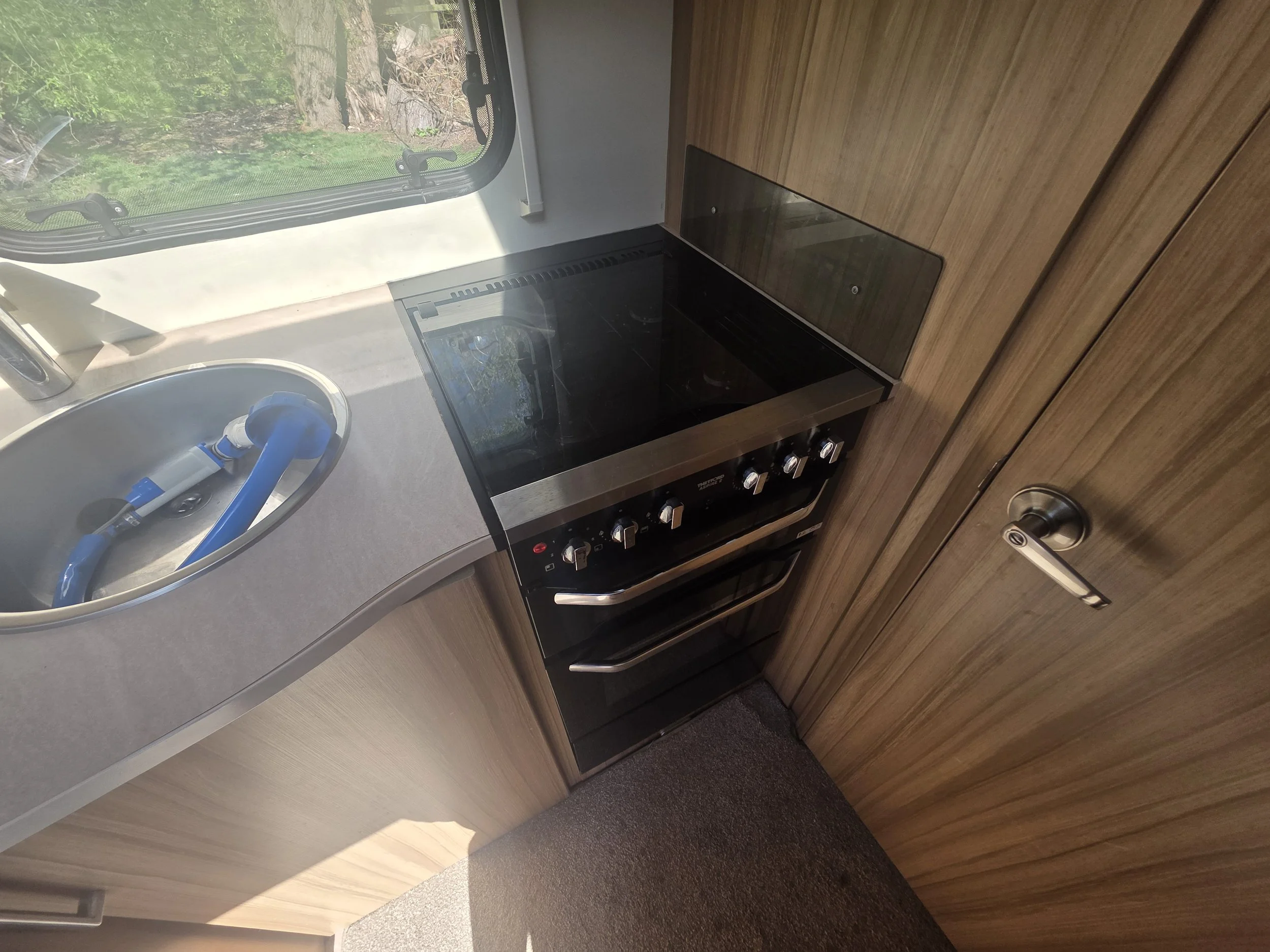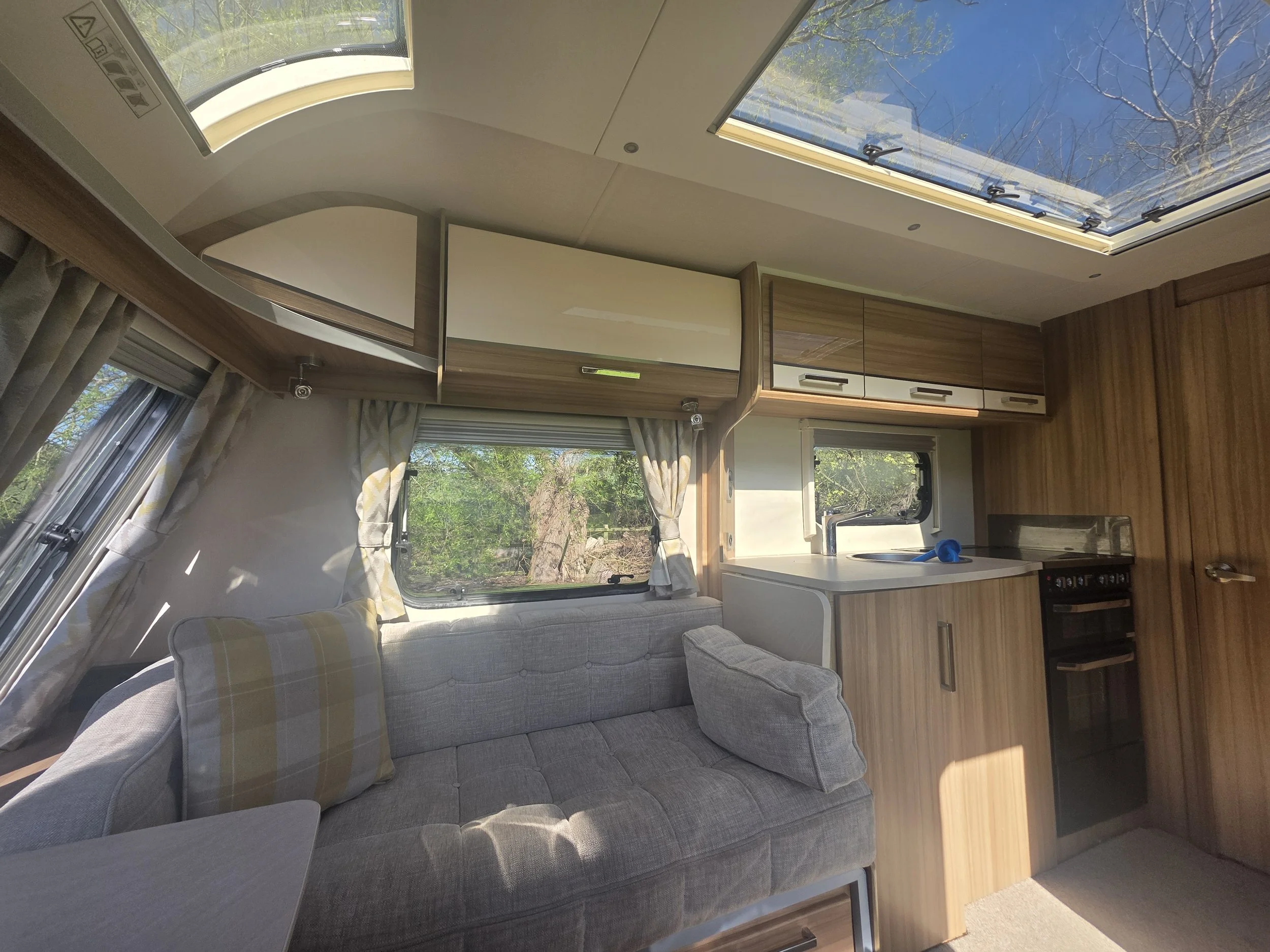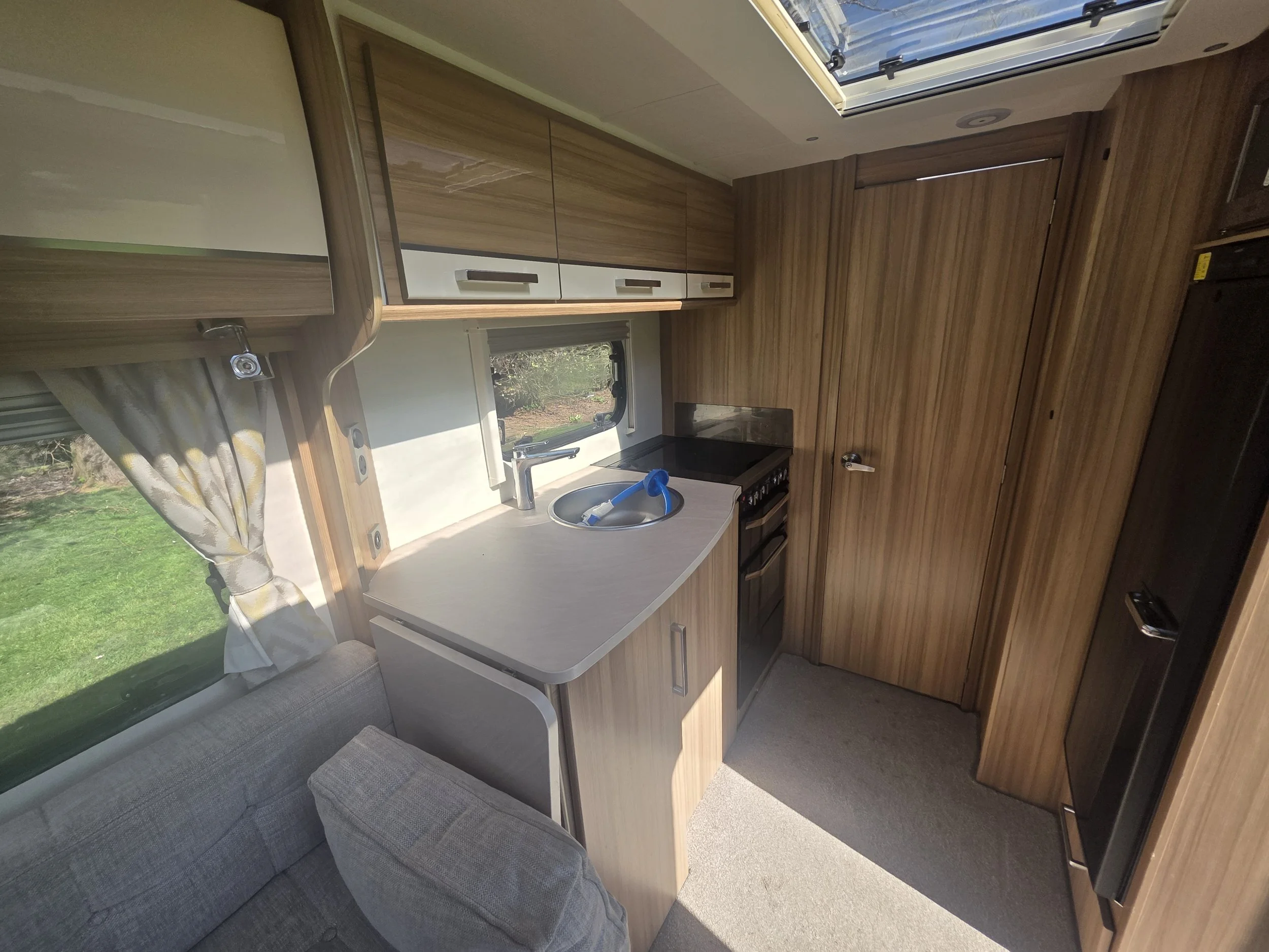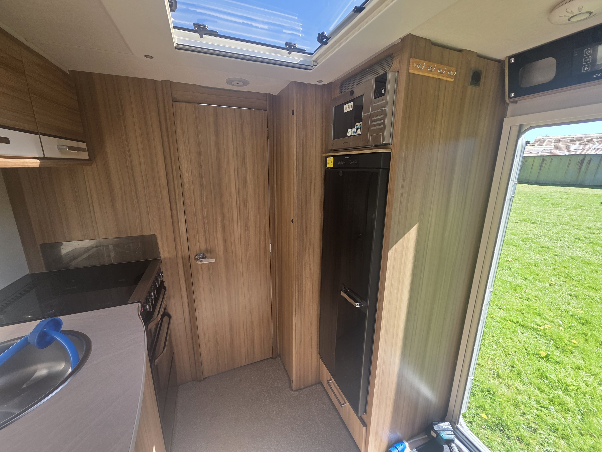 The fully equipped kitchen includes a full cooker, fridge/freezer, microwave, and ample worktop and cupboard space, making it perfect for both short breaks and longer touring holidays. For year‑round comfort, the caravan is fitted with Alde wet central heating.