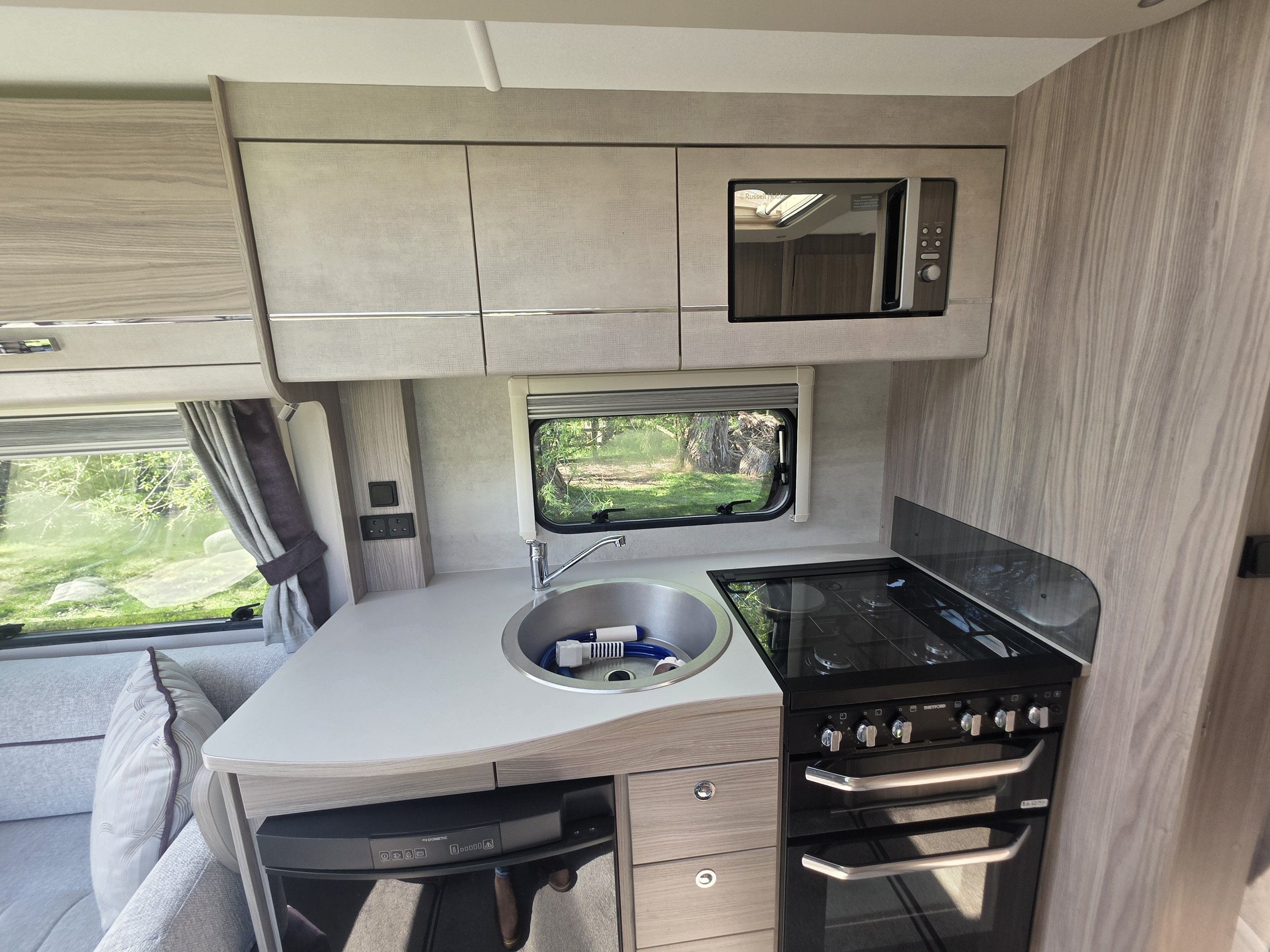 The central washroom includes a separate shower cubicle, toilet and wash basin, offering privacy and convenience. The well‑equipped kitchen comes complete with a full oven, grill and hob, microwave, fridge/freezer and ample cupboard space, making it ideal for both short breaks and longer stays.