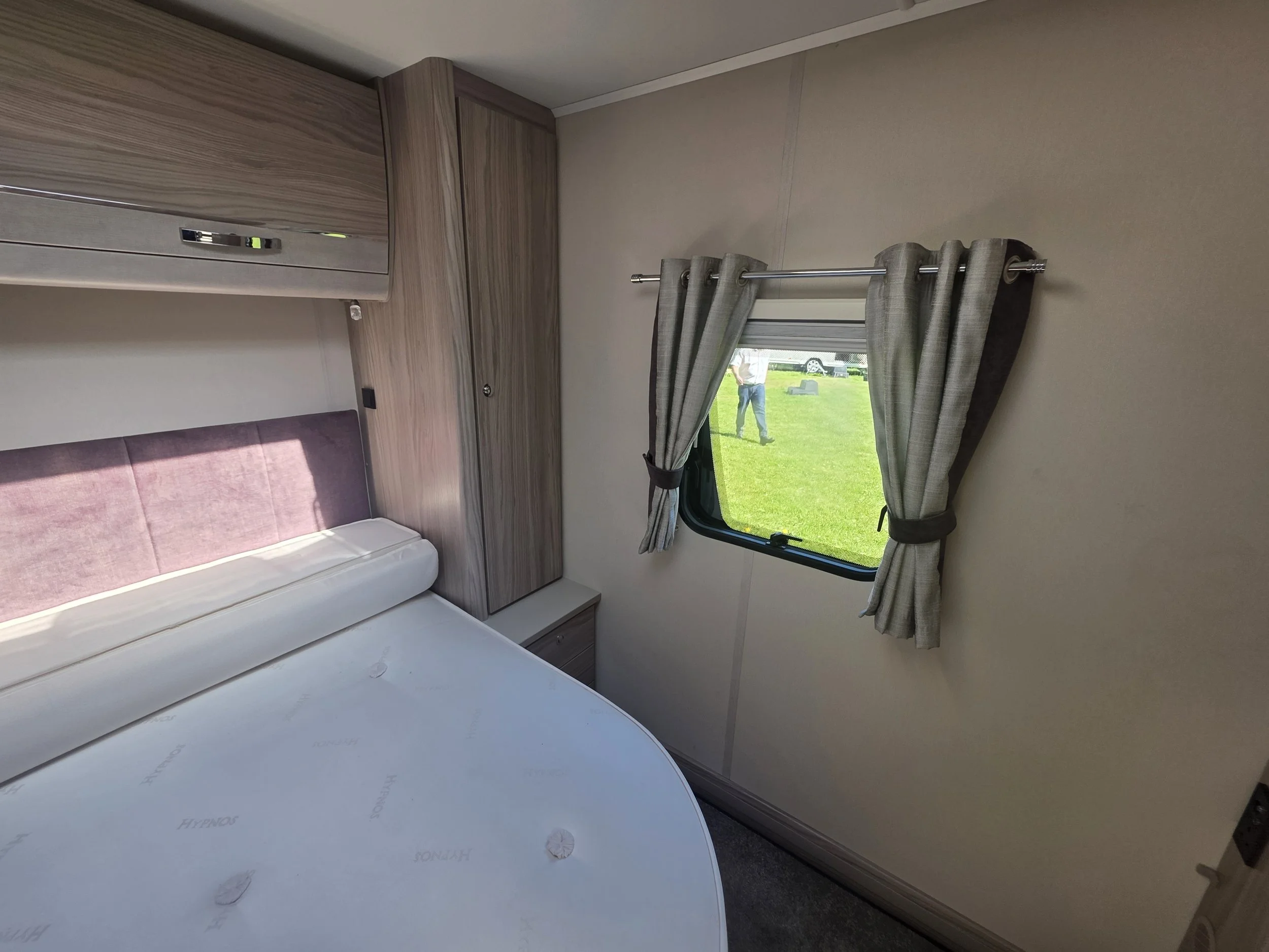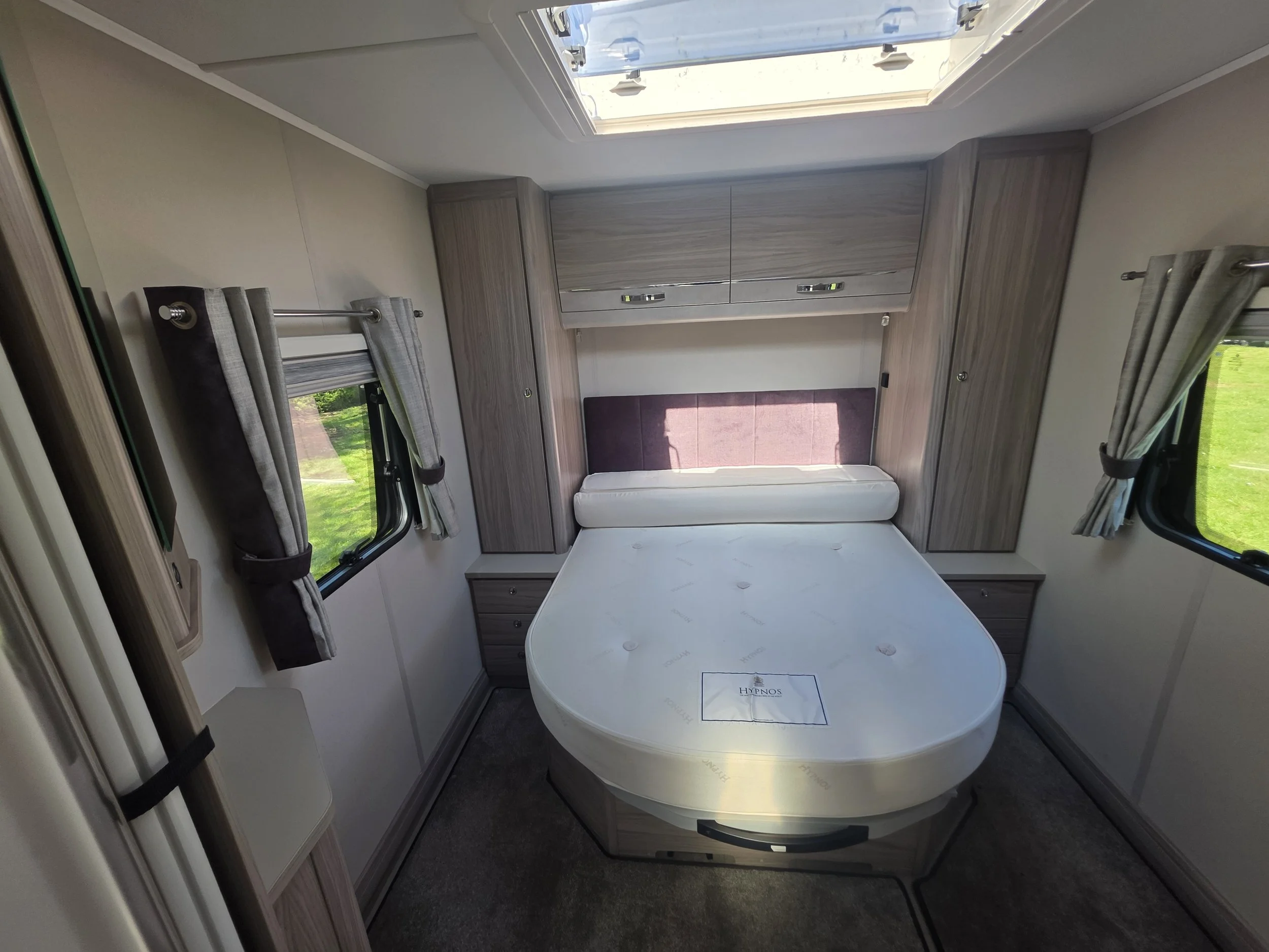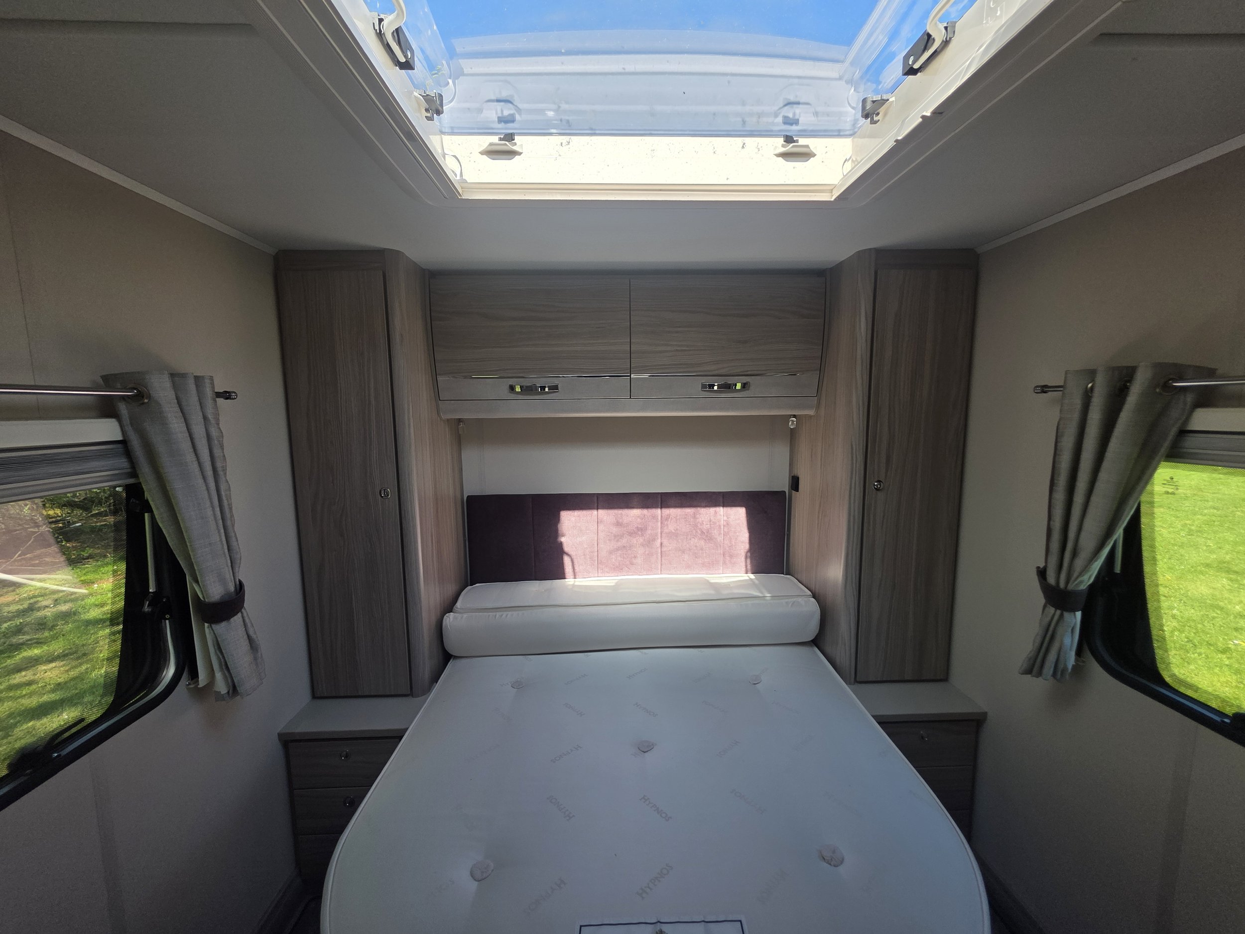 Inside, the caravan features a spacious front lounge with parallel seating that easily converts into a large double bed. To the rear is a fixed island bed, allowing walk‑around access on both sides and providing a permanent, comfortable sleeping area with storage beneath.