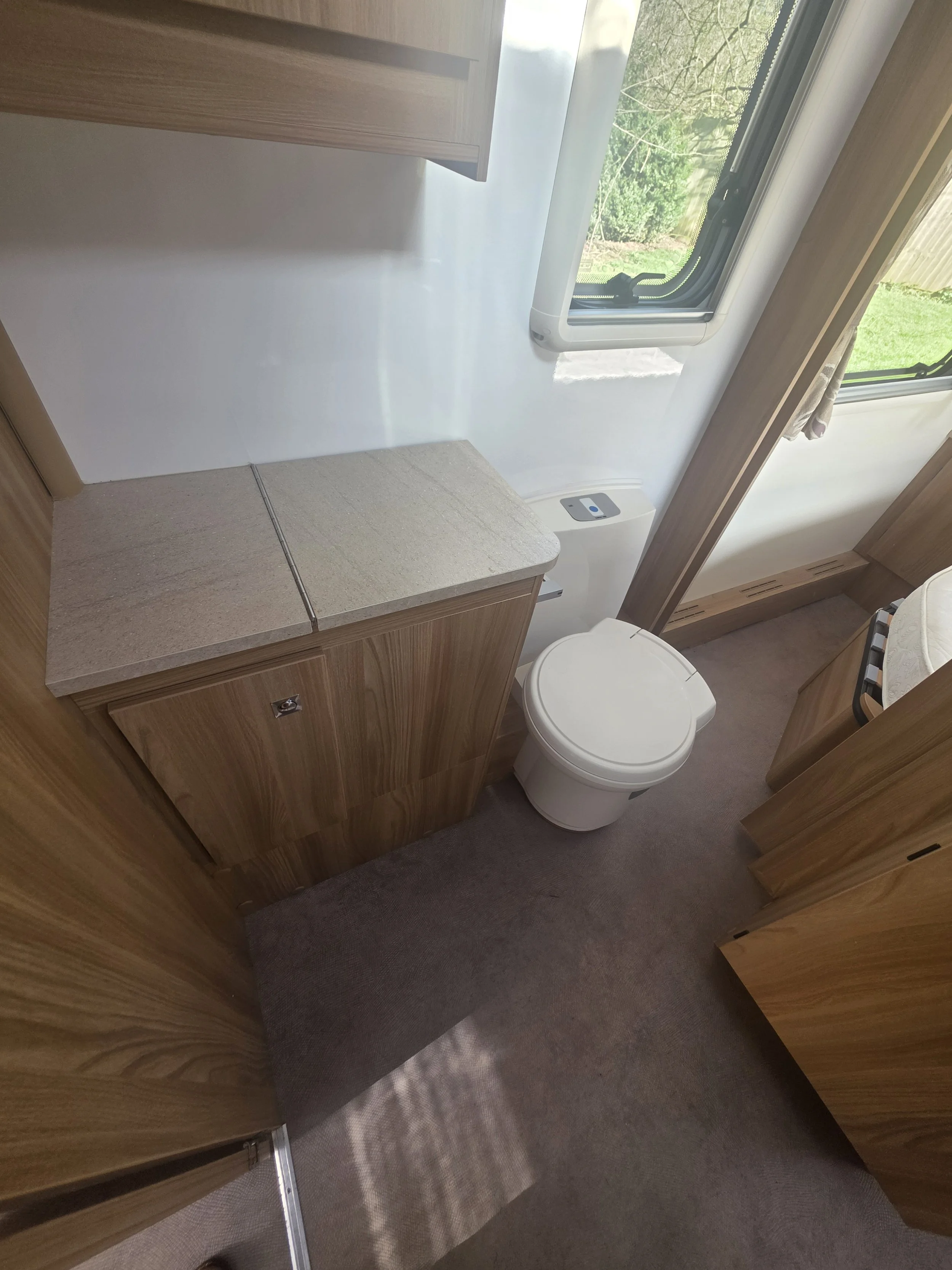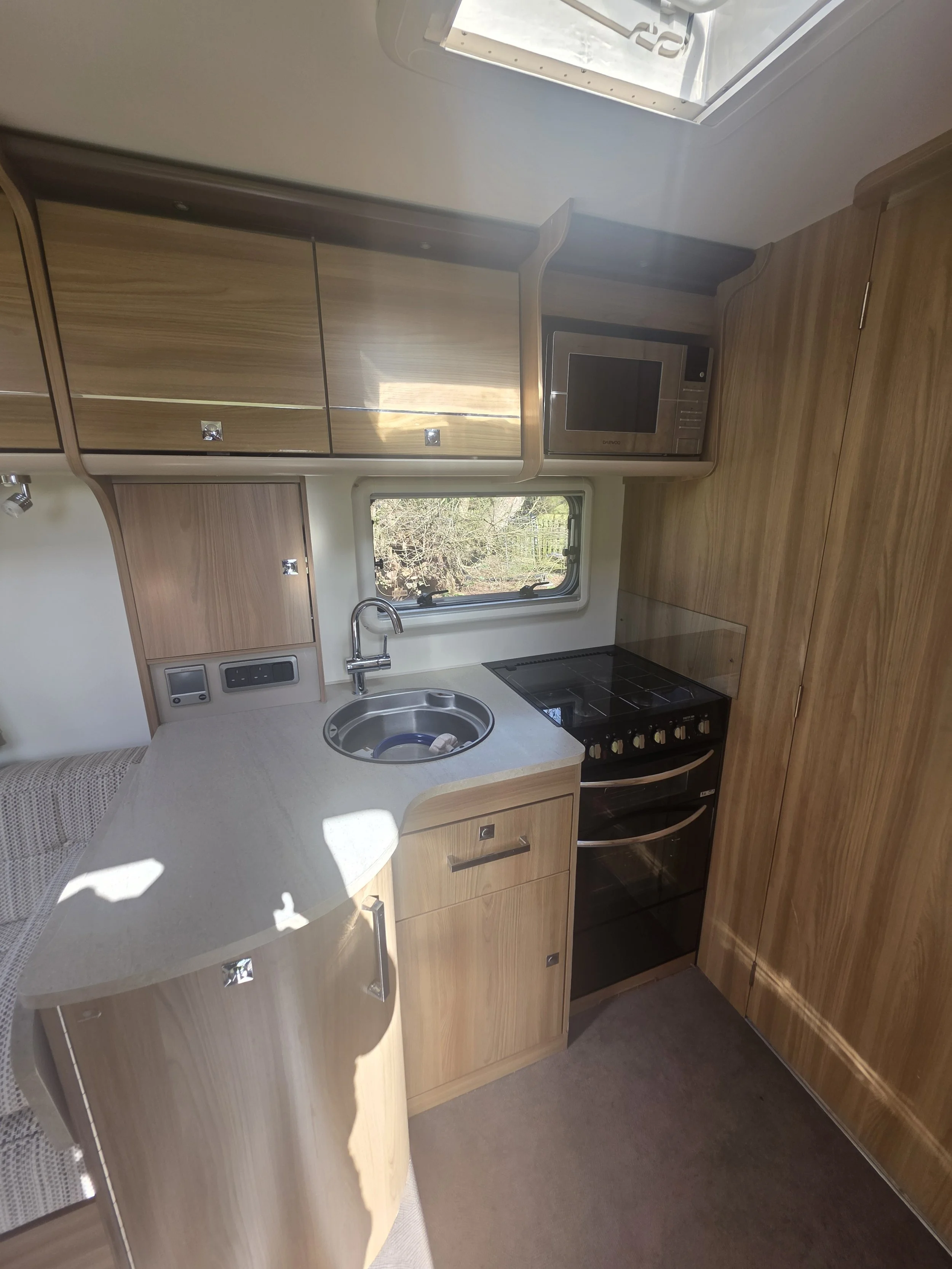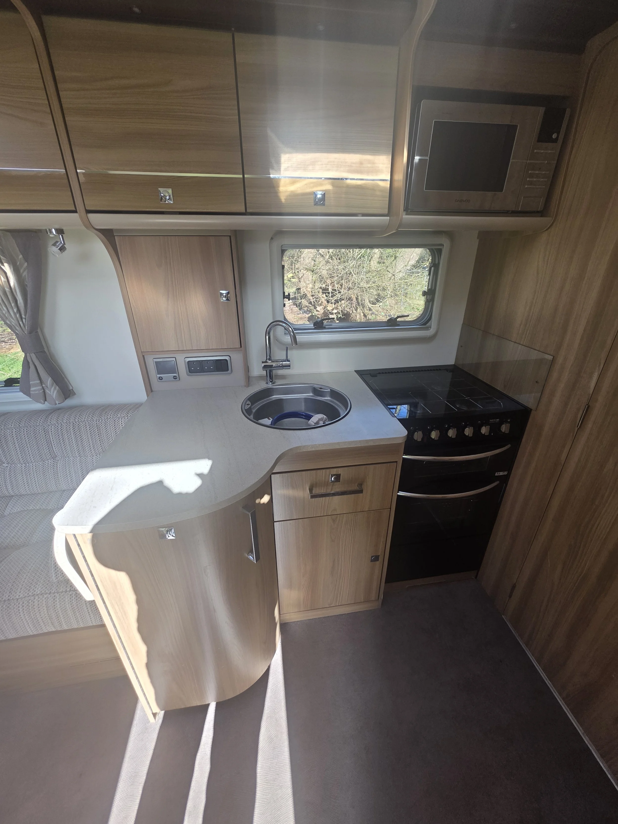 Fitted with a power mover, this caravan is easy to manoeuvre on site, making set‑up simple and stress‑free. The fully equipped kitchen offers ample storage and workspace, and the spacious end washroom provides excellent facilities for extended touring.